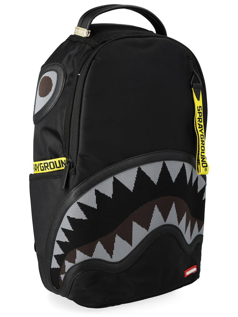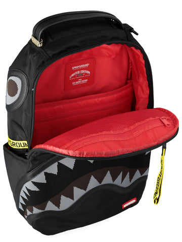 Mochila Sprayground Shark Central Yellow Tape, confeccionada en tejido técnico negro con inserciones de tela. Presenta detalles en amarillo neón con el logo SPRAYGROUND, un bolsillo frontal y un bolsillo de almacenamiento con cremallera, además de bolsillos laterales y una espalda ergonómica de malla acolchada. También cuenta con compartimentos para gafas y portátil, correas ajustables y la insignia "Sprayground Authentic".